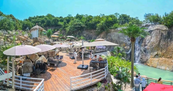 Designed with Southeast Asian-inspired aesthetics, the park integrates natural terrain and stones to create palm-thatched pavilions, stilted platforms, tropical landscapes, waterfalls, and Thai-style cottages.
