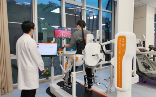 A rehabilitation patient uses an advanced robotic exoskeleton treadmill system under medical supervision at the Lanting campus of Shaoxing Second Hospital. [Photo/Tide News]