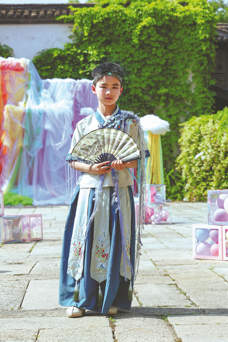 Young students from Maodun Experimental Primary School in Puyuan town, Jiaxing, Zhejiang province, are encouraged to unleash their creativity on basic traditional garments and showcase their designs themselves on the runway of this year's Puyuan Fashion Week on Sunday. CHINA DAILY