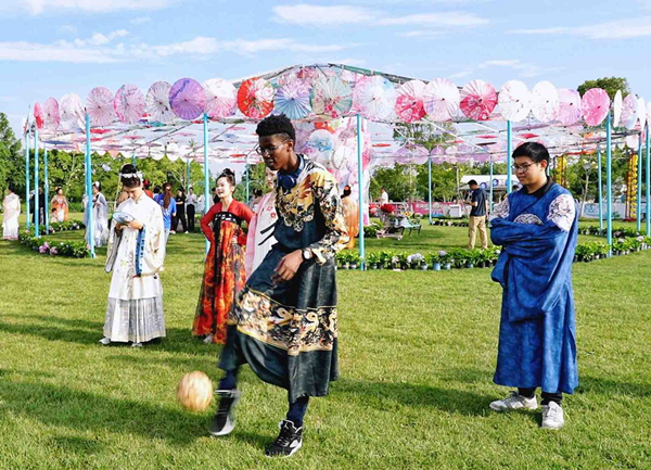 Zambian visitor Lukundo Silungwe is experiencing Cuju, an ancient Chinese soccer game. [Provided to chinadaily.com.cn]