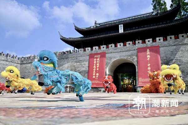 The robot dogs dressed in traditoinal costumes perform the lion dance in Jiaxing, Zhejiang province. [Photo/Tide News]