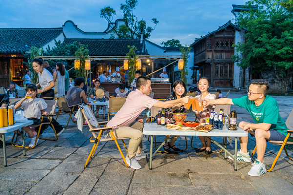 To welcome the summer holidays, a peak season for diverse travel demands such as family and graduation trips, Puyuan Fashion Town in Tongxiang, Zhejiang province, has launched a variety of activities including water fights, boating, open-air karaoke, pool parties, paddling, aromatherapy and singing bowl meditation, offering visitors a rich and refreshing vacation experience.