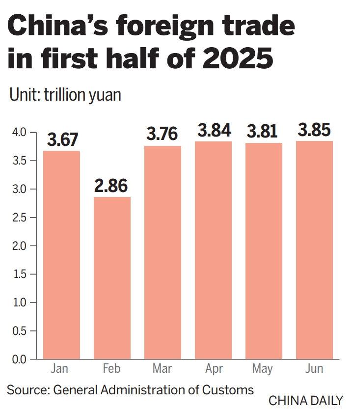 He said that China's trade with over 190 countries and regions registered growth between January and June, with 61 trading partners each recording trade volumes above 50 billion yuan ($6.97 billion) — five more than in the same period last year.