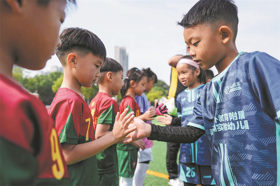 Young players greet each other before the start of a match in the kindergarten. [Photo by Sheng Jiachun/For China Daily]